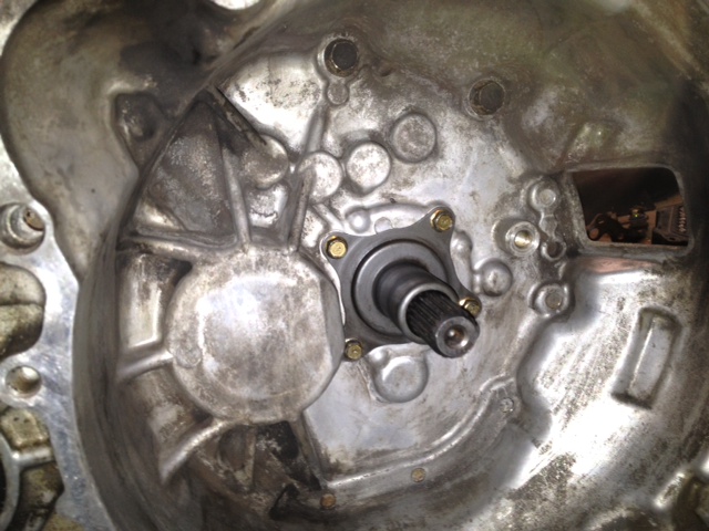 De versnellingsbak is los en ligt op een werkbank of op een plaatje hout of wat ook en nu is te zien dat het ding eigenlijk bestaat uit 2 helften. Het deel waar je inkijkt en je de as met spiebanen in ziet wordt wel de 'schelp' genoemd. Dit hoort droog te zijn! Geen natte bende of olieplekken! Het kan wel onder de zwarte 'koek' zitten maar dat is niet erg. Als je het een beetje fris eruit wil laten zien dan haal je op een later moment een ontvetter erdoorheen, maar doe je dat niet, ach: ook goed, niemand die het ziet en je koppelingsplaat, drukgroep en druklager (die nu nog aan die as vastzitten) zal het ook een zorg zijn. Zit er duidelijk olie dan is de kans groot dat de keerring is gaan lekken. Zo'n keerring kost 3x niks, maar eenvoudigweg alleen dat vervangen is waarschijnlijk niet genoeg. We gaan dat zo direct verder onderzoeken!