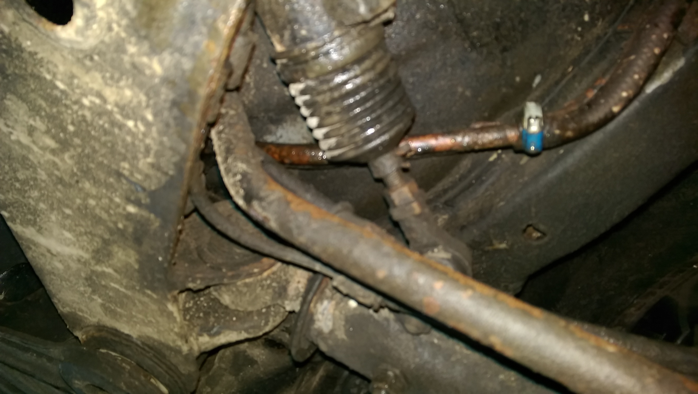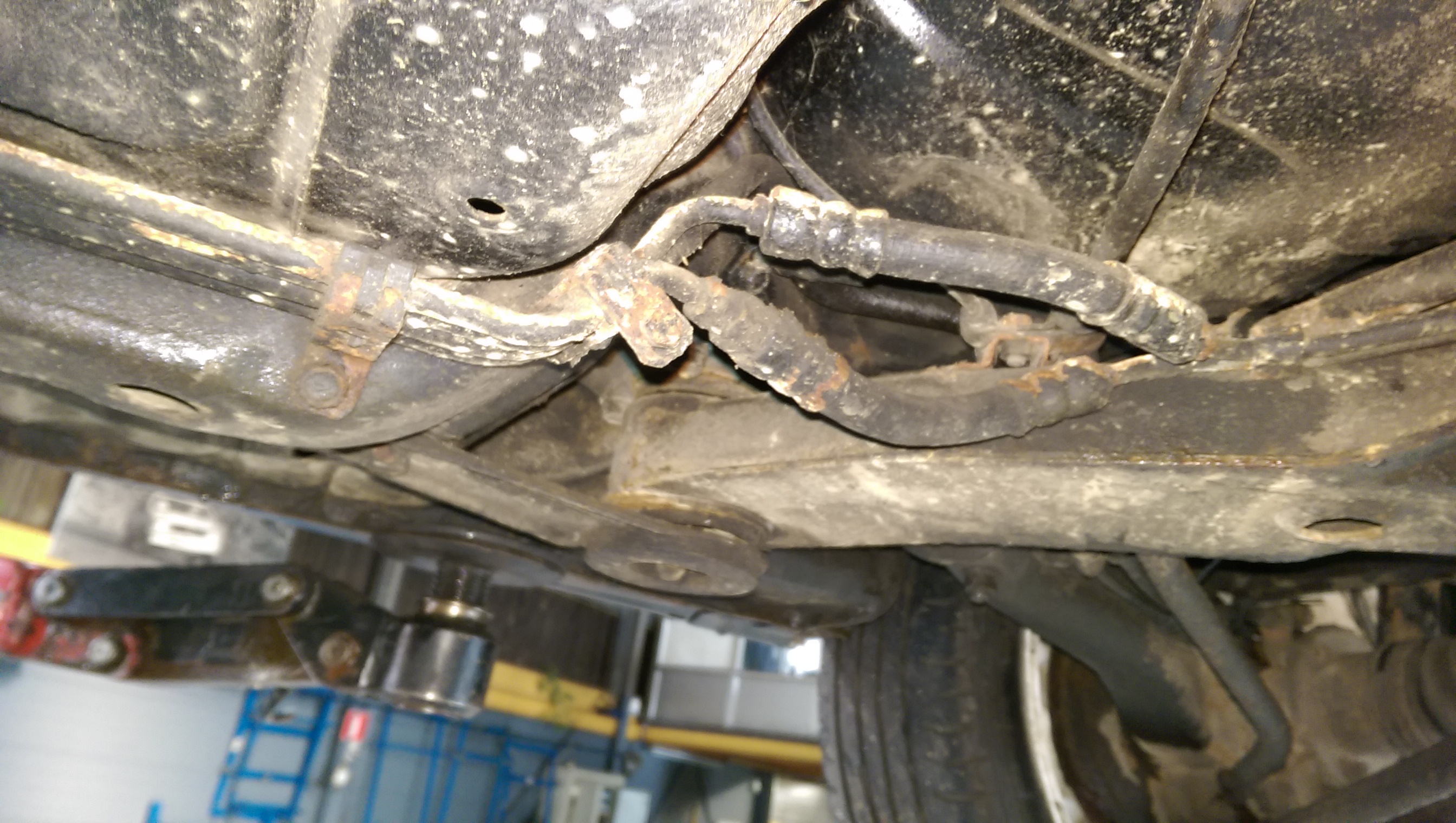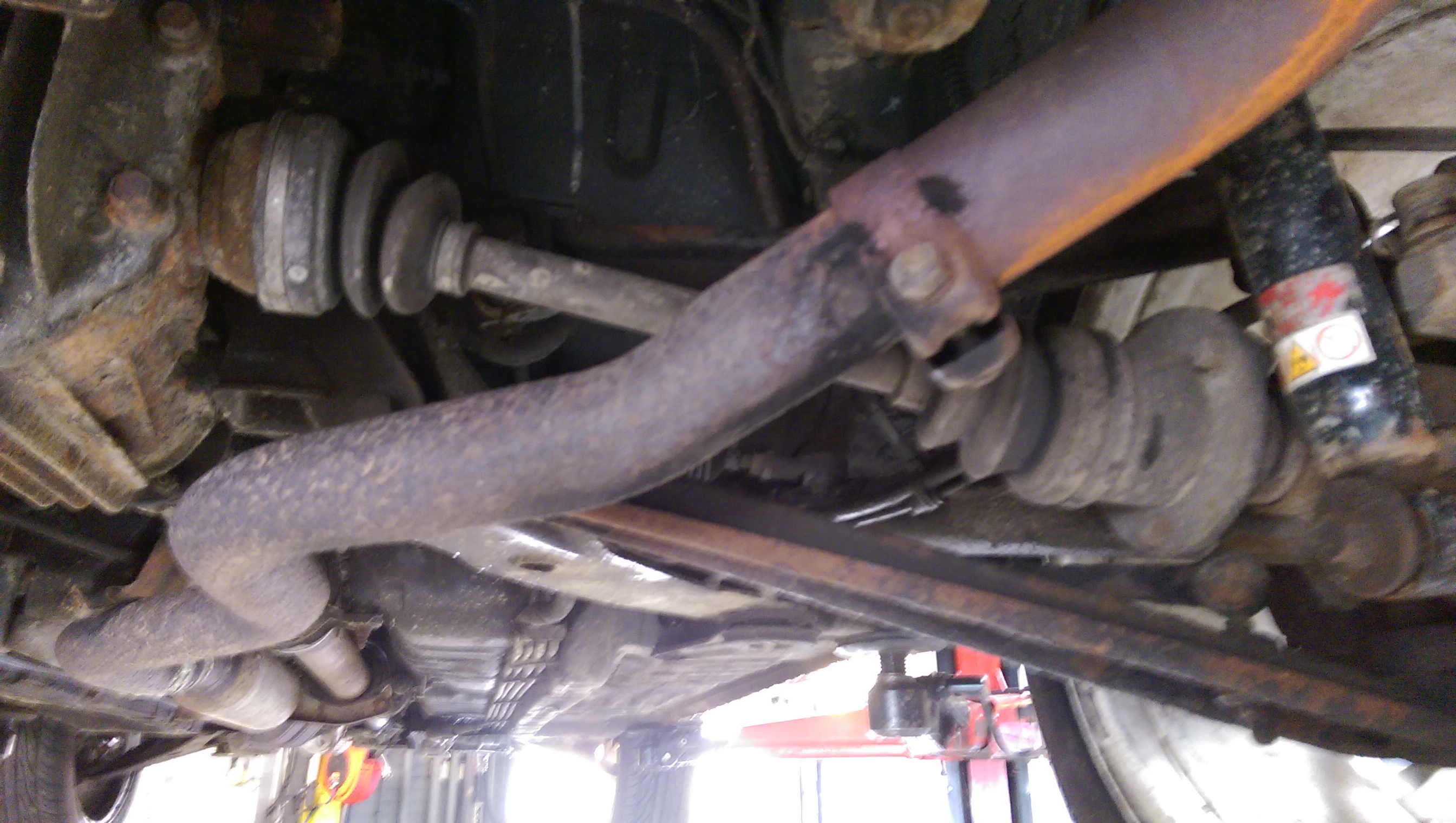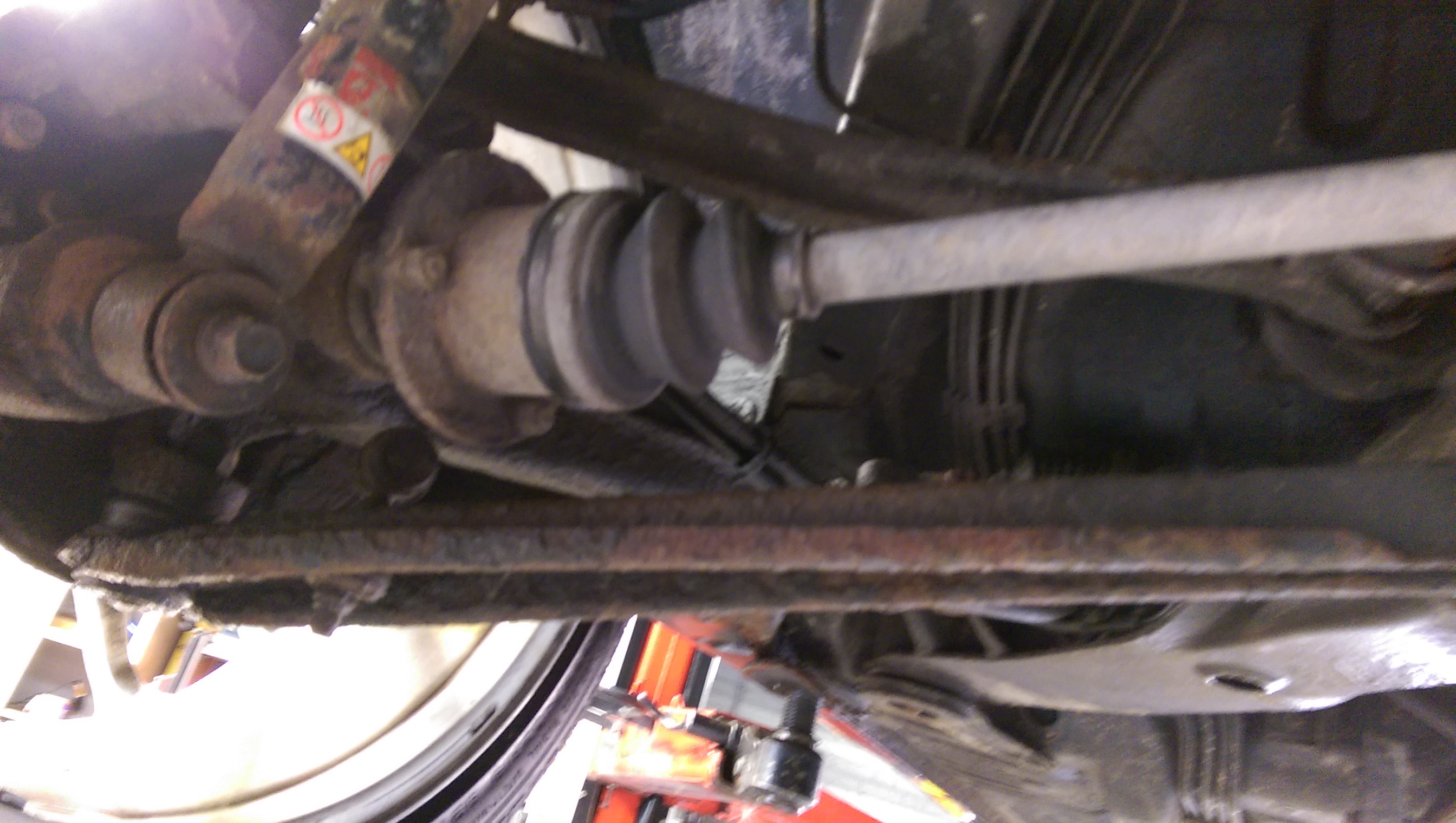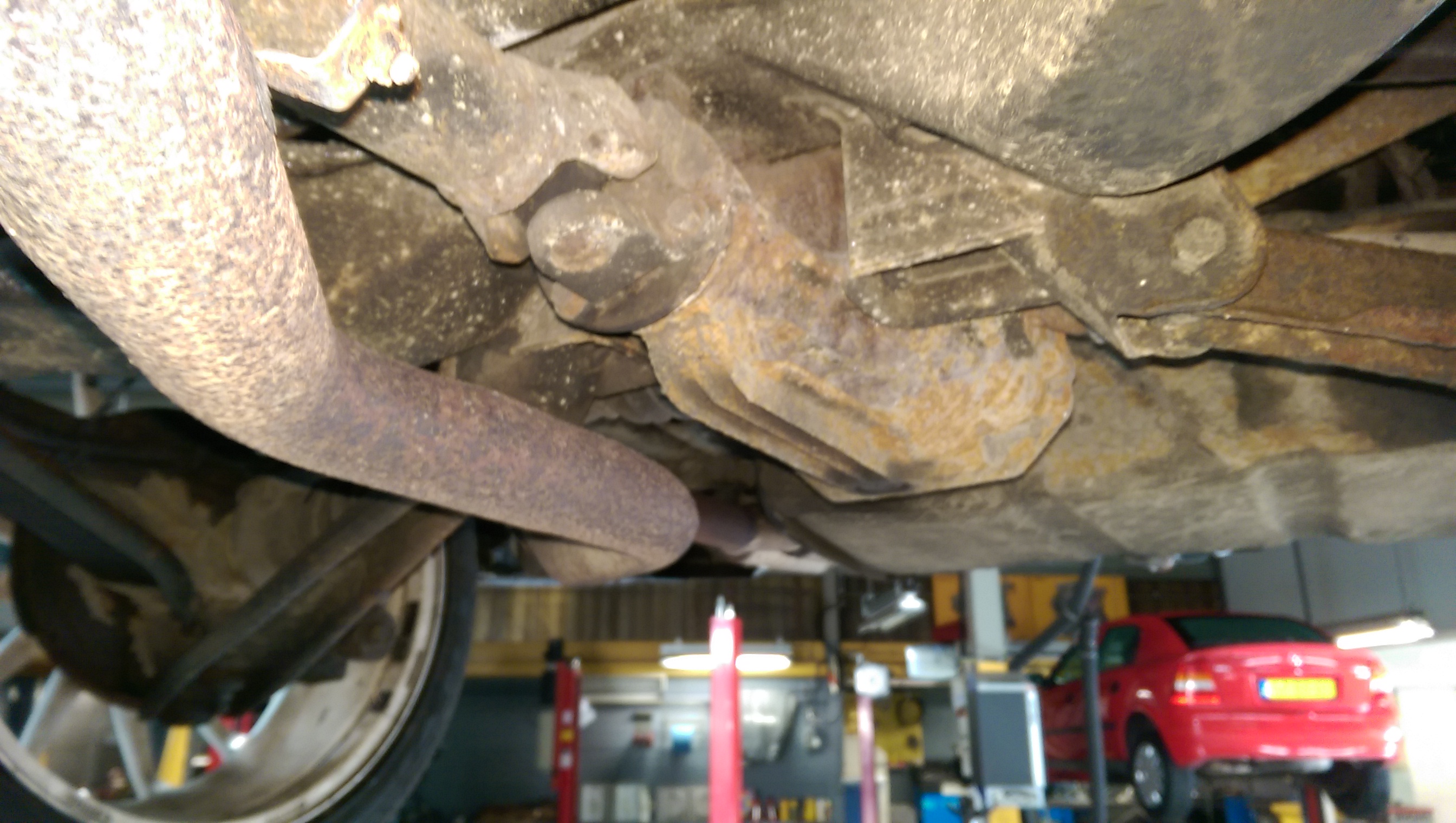 Vervolgens een grondige inspectie van de carrosserie. Moet zeggen dat dat niet tegen viel, maar llinks en rechts is er zeker wat klein laswerk. De hoeveelheid vliegroest is echter enorm, daar moet ik wel echt actie mee ondernemen. Verder een kapotte ashoes, kogelhoesjes, voorpijp lekt een beetje bij het flexibel stuk, een drietal ophangingsrubbers die slecht en uitgeslagen zijn en stabilisator slangetjes met enorme speling.