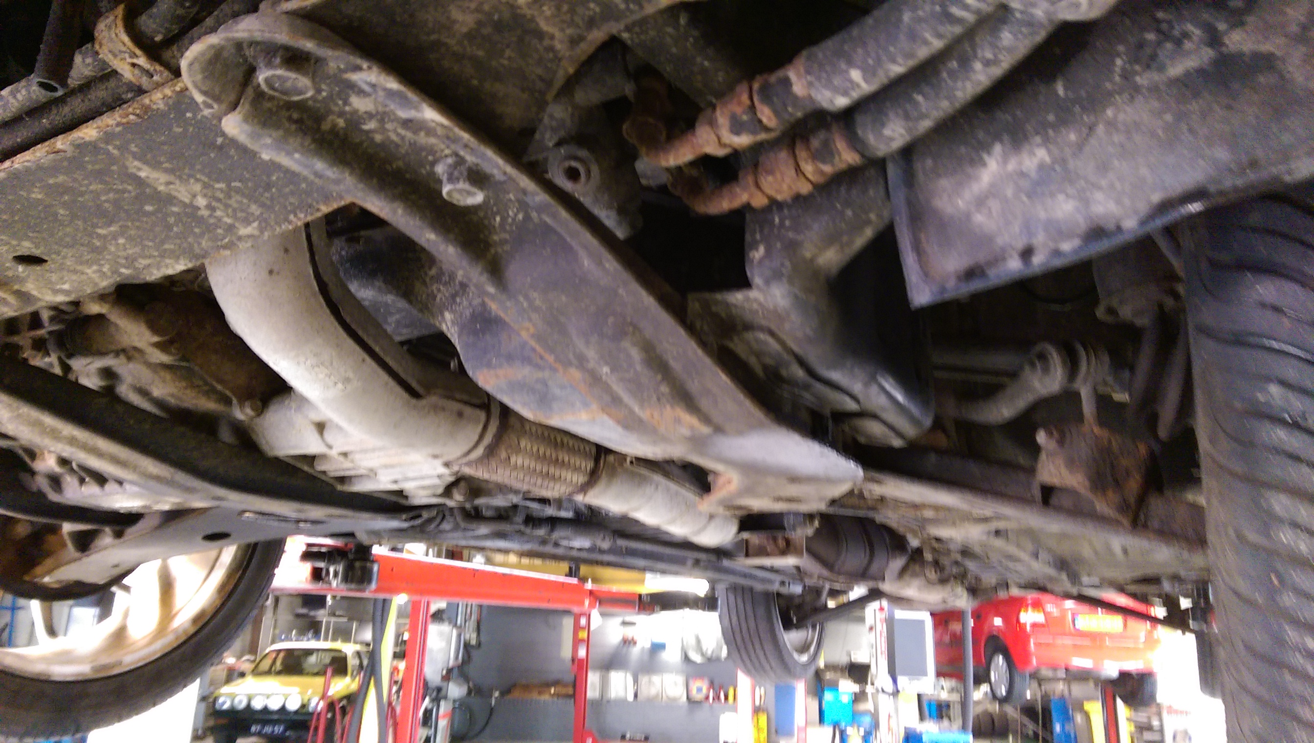 Vervolgens een grondige inspectie van de carrosserie. Moet zeggen dat dat niet tegen viel, maar llinks en rechts is er zeker wat klein laswerk. De hoeveelheid vliegroest is echter enorm, daar moet ik wel echt actie mee ondernemen. Verder een kapotte ashoes, kogelhoesjes, voorpijp lekt een beetje bij het flexibel stuk, een drietal ophangingsrubbers die slecht en uitgeslagen zijn en stabilisator slangetjes met enorme speling.