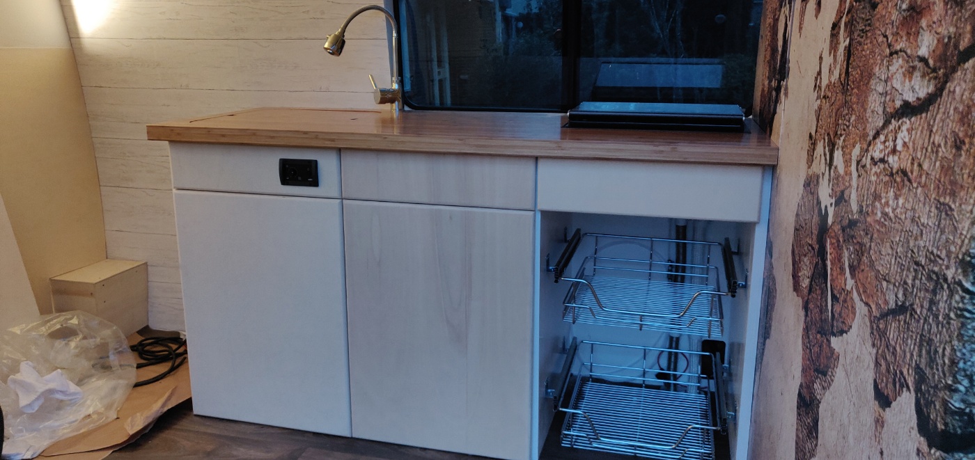 Een enorme klus opnieuw, met een voorzijde die perfect recht moet zijn om de grote klep goed te laten werken, de koelkast te laten passen en onderin een eenvoudig uitschuiftoilet.