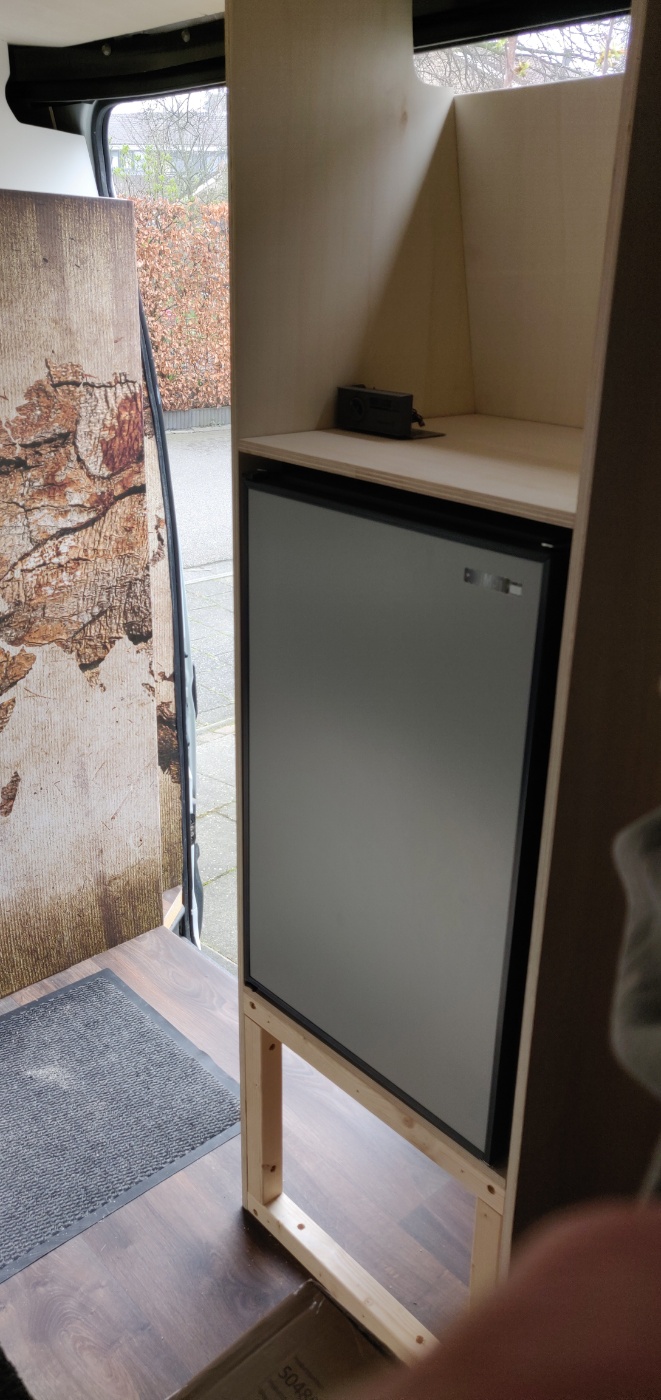 De koelkast staat vast aan de plank waarop 'ie staat met schroeven die door de rubber voetjes gaan. Die plank zit op zijn beurt weer vast aan het balkenframe waarop het rust. Superstevig. Het temperatuur instelknopje hebben we losgehaald van de koelkast. Anders zou er 6cm hoogte verloren gaan aan een regelknopje van nog geen 10cm breed en 5cm diep. Beetje onzin. Dus die staat nu op de plank boven de koelkast, waar Joyce een houten afwerkframepje omheen heeft gebouwd.