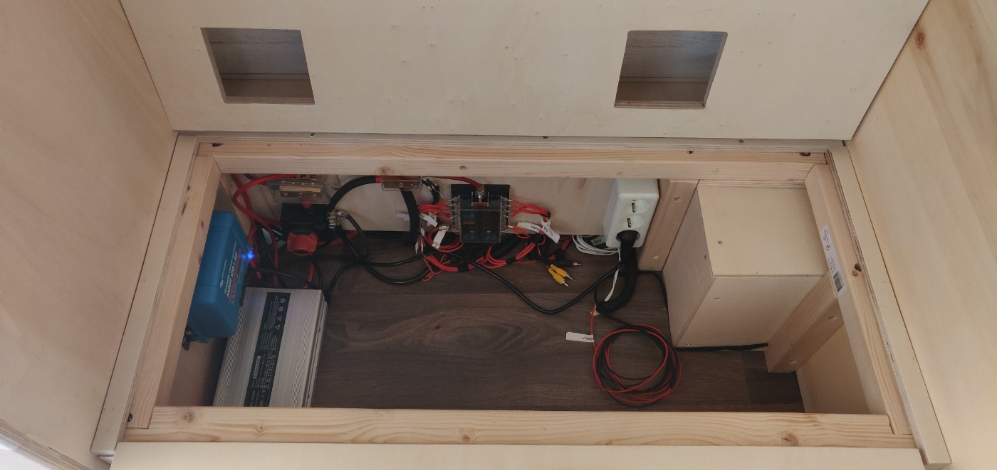 De meterkast is verder opgeruimd en heeft nu ook een inzetplank die alle apparaten genoeg ruimte en lucht geeft, maar toch een afscherming geeft zodat het vrije deel als opslagruimte gebruikt kan worden. De hoofd aan/uit knop om het hele huishuidsysteem uit/aan te kunnen schakelen via de vierkante bovenaf-luikjes. Ook het 220V stekkerblok blijft met het inzetstuk nog steeds van boven/buitenaf direct bereikbaar.