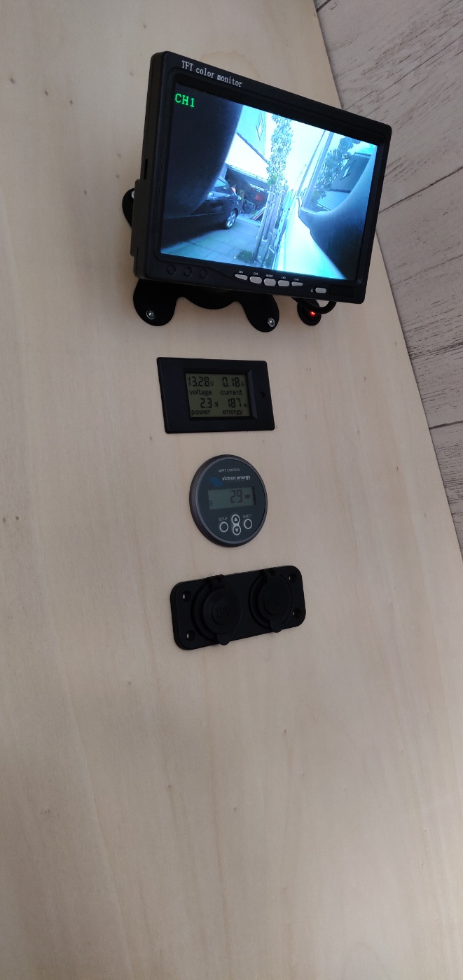 Ook hebben we in deze kast de energiemeter die afleest via een 'shunt' hoeveel stroom er over de huishuidaccu's loopt, het voltage en nog zo wat nuttige gegevens om de staat van de accu's af te kunnen lezen. Ook zit er een Victron metertje in die de gegevens zal tonen van de zonnepanelen. En om het af te maken, het eerste 12V high-Amp 2x USB lader + 12V sigarettenaansteker-AUX plug voor allerhande apparatuur met zo'n stekker. Om deze 3 units zit ook weer een houten framepje zodat het afgewerkt is en er geen kans is op loskomen van bedrading.
