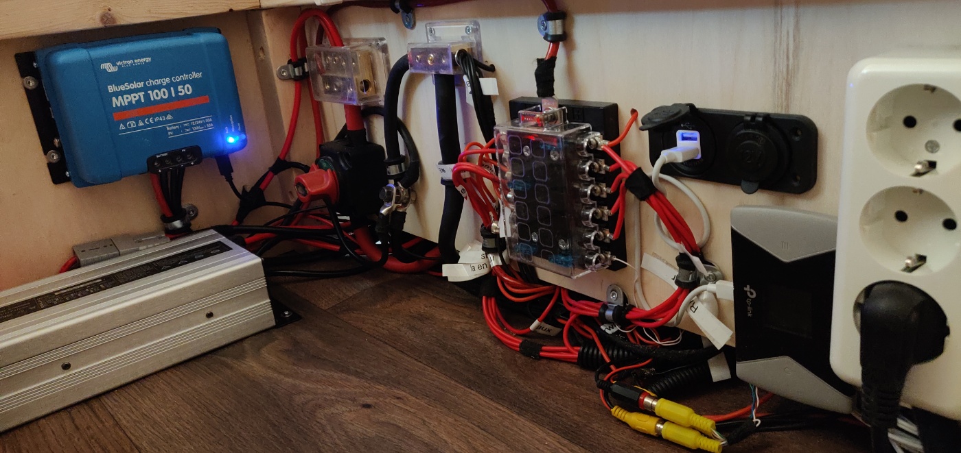 - een wat oversized 220V>12V omvormer, waarmee de huishuidaccu's opgeladen worden als er 220V van externe bron wordt aangesloten op de bus