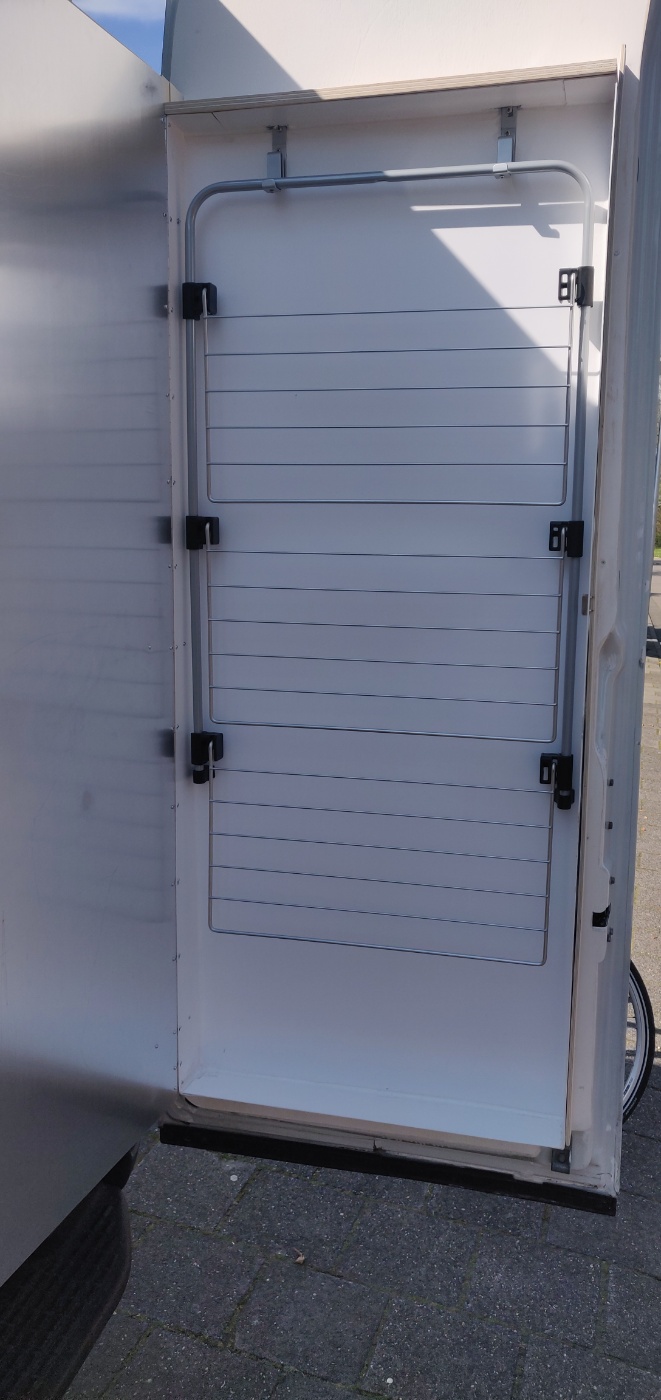 In de vandaag gemaakte kast komt een kleding droogrek met uitklapbare delen waar vooral haar wetsuits kunnen uithangen en worden opgeborgen. De andere kast wordt een uitvouwdouche. Die constructie heb ik half in mijn hoofd, maar dat wordt nog wel een uitdaging!