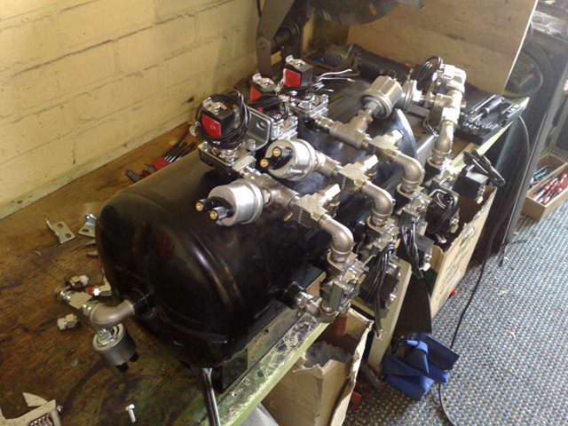 Kofferbak LPG tank, lucht tank en compressors weggewerkt en bekleed met leer