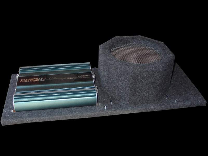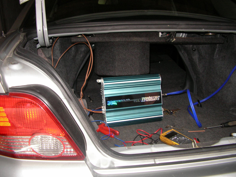 Om de woofer aan te sturen had ik zelf al wel een mooie dikke stroomkabel gelegd vanaf de kofferbak tot en met het schutbord en RCA kabels lagen er ook al. De stroomkabel zit op een earthquake PH2000W/D1 (klasse J) mono versterker. Op 4 Ohm 500W RMS... genoeg in ieder geval voor de Atomic QT (quantum) 10 woofer.