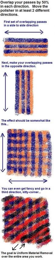 De poetsbeweging is van belang. Subtiliteit is het kernwoord. Geen gorillapraktijken maar gecontroleerde, rustige bewegingen (zie volgende afbeelding). Hou hierbij ten alle tijden de poetspad volledig vlak. Een gekantelde pad kan leiden tot hologrammen of zelfs verbranding van de lak aangezien alle druk op een klein oppervlak komt. Vergelijk de bewegingen met grasmaaien, je maait iedere baan, en met de volgende baan overlap je de vorige weer met 50%. Zo zorg je voor een uniforme verwijdering van beschadigen of swirls. Doe het paneel eerst met horizontale bewegingen en daarna met verticale (of zelfs diagonale) bewegingen. Zorg dat de pad niet verzadigd is met polijstmiddel maar maak deze regelmatig schoon met een tandenborstel. Zet de machine aan en ga even met de tandenborstel over het oppervlak heen van de pad zodat het overtollige product van de pad af kan vliegen. Voor de slimmeriken: houdt de machine van de auto af anders zit deze onder.