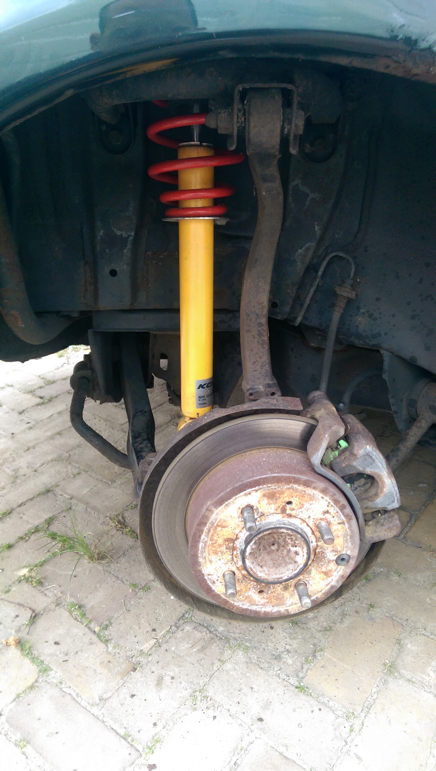Bij thuiskomst heb ik gauw de oude achterdempers/veren vervangen voor gele Koni's met H&R -35mm veren. Mooi net op tijd klaar voor de regen.