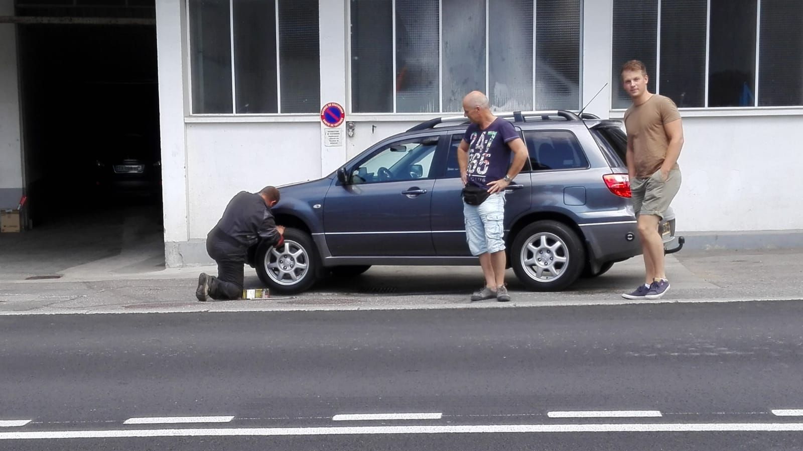 We stonden bijna bovenop een berg te genieten van het uitzicht. Toen ik terugliep naar de auto viel mijn blik op een grijs rondje in de voorband. Ja, een schroef. En die zat er diep in. Sinds vorig jaar gooi ik een volledig reservewiel (geen thuiskomer, die redt het niet als er een caravan aan de haak hangt) achterin de auto als we op vakantie gaan. Gelukkig heb ik het wiel niet hoeven verwisselen, maar ik was wel blij dat ik die bij me had. In La Clusaz zat een "Pneus service" waar ik de schroef uit de band heb laten halen. Veel langer doorrijden kon ook niet want er was al aardig wat lucht ontsnapt. Op de foto zie je de monteur die op zijn knieën aan het werk is om een prop in de band te stoppen.