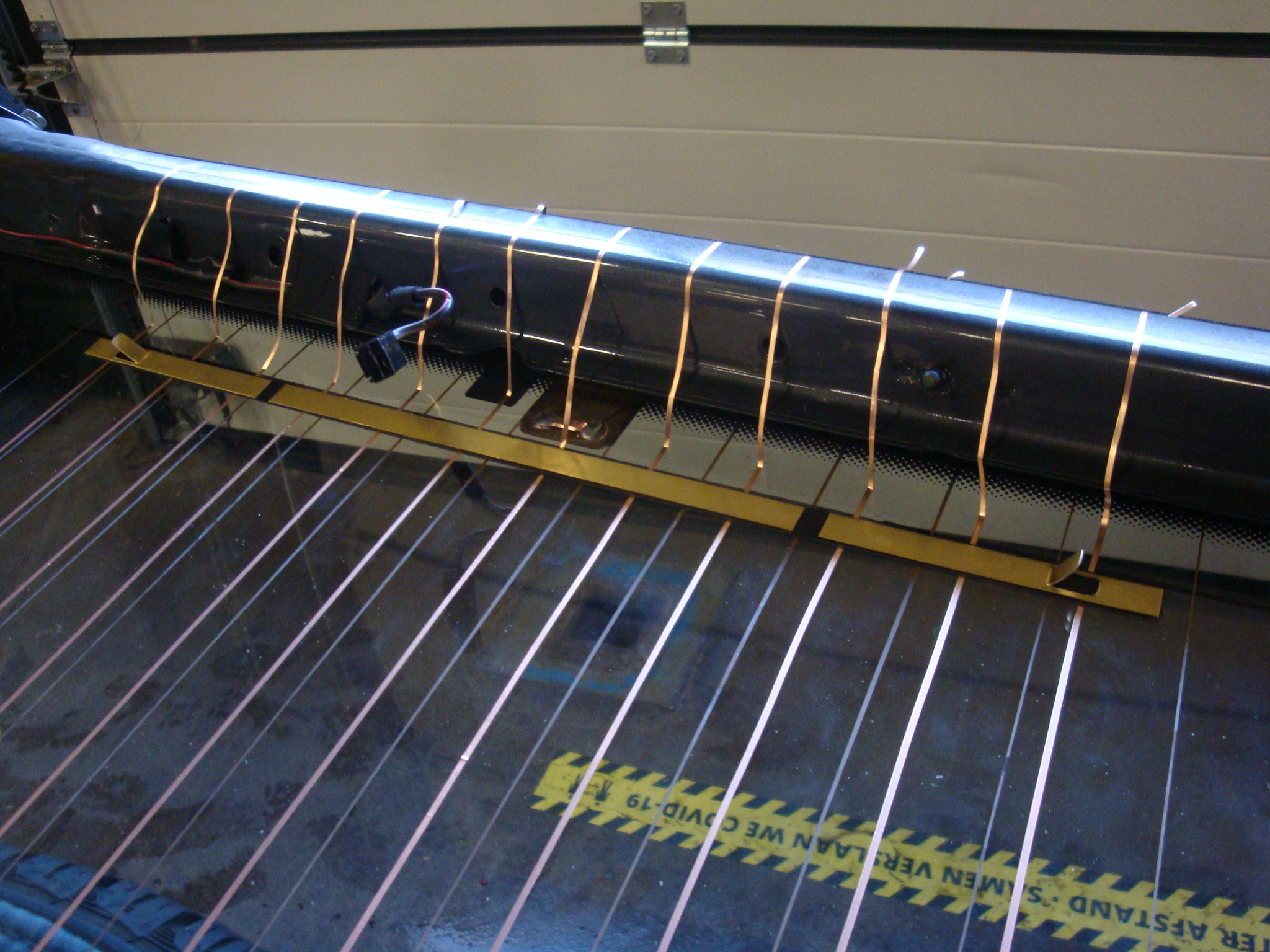 Foto 5 Hier zie je de messing contactstrips die op een foamstrip zijn geplakt (alles zelfklevend). Plus en min zitten aan dezelfde kant, want de stroom gaat door drie draden heen - terug - heen - en weer terug. In totaal 12 elementen dus (origineel was 13).