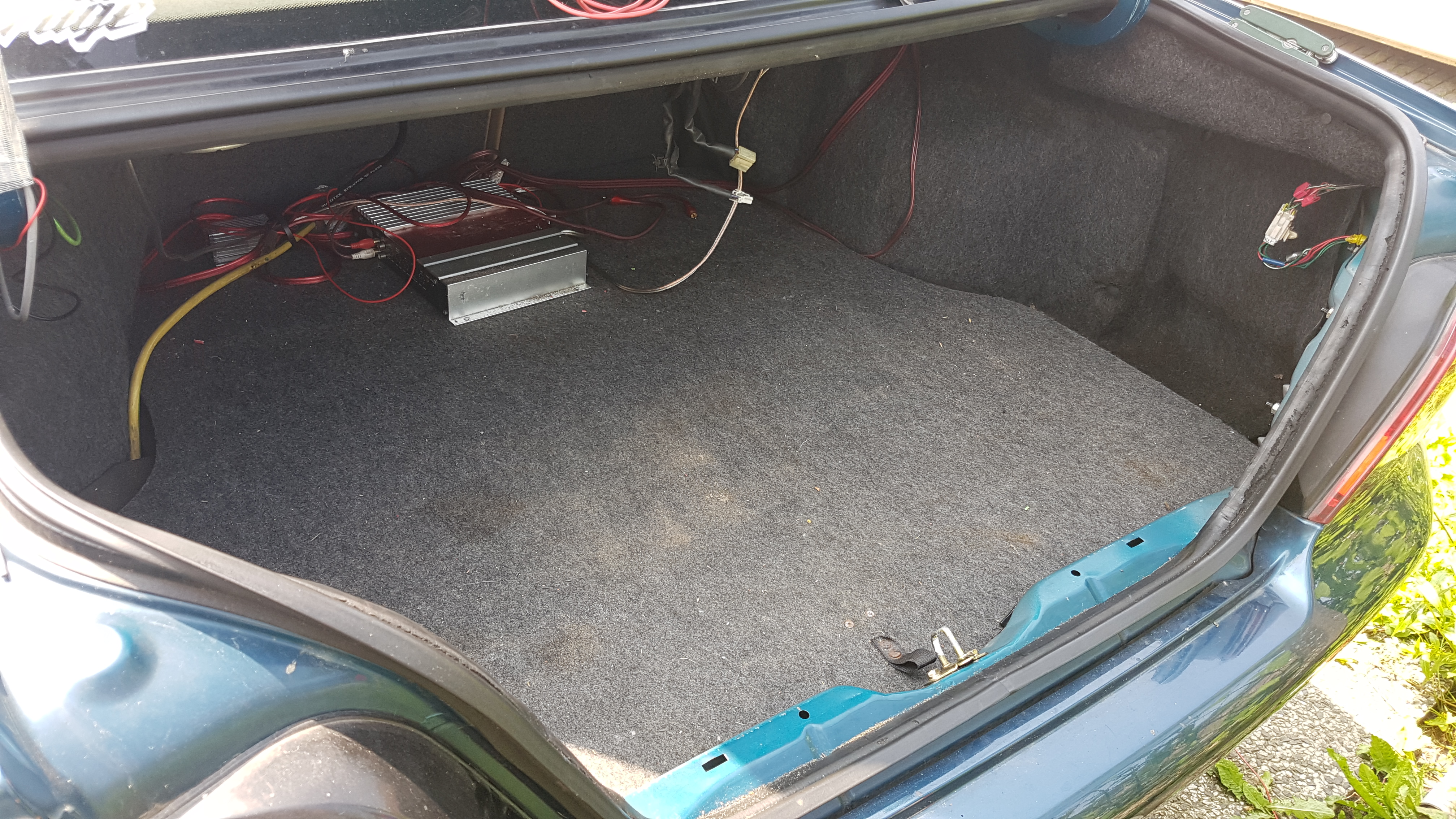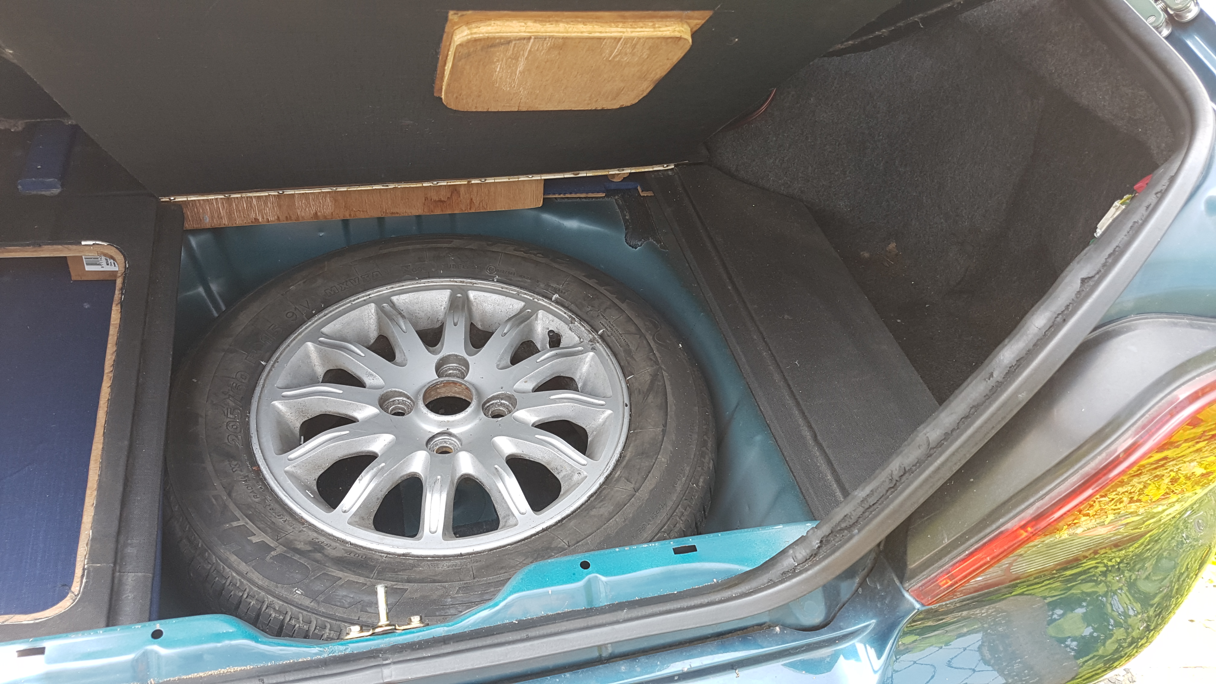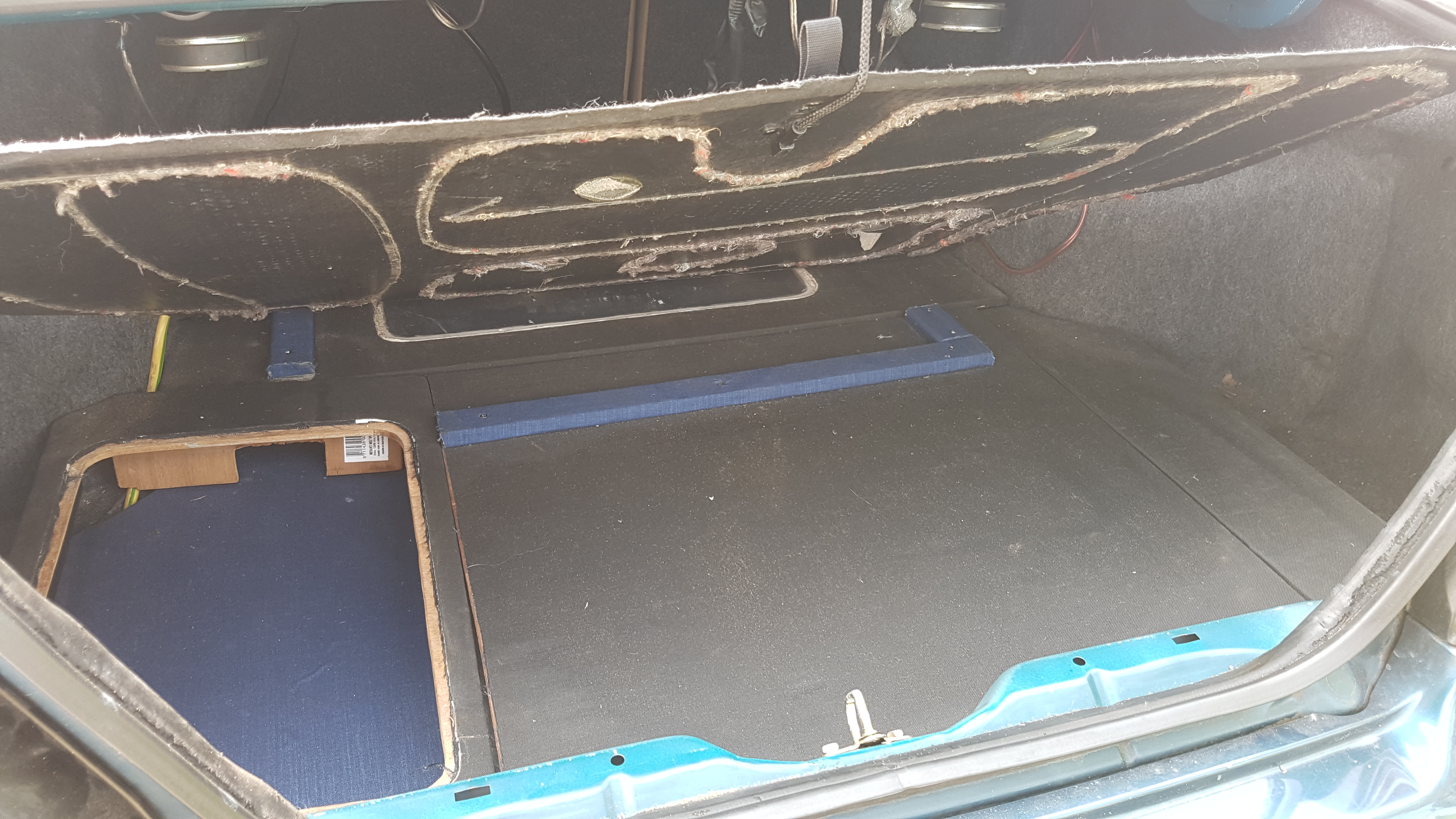 Heeft een luik voor het reserve wiel/gastank. 2 gaten waar je een versterker achter kan zetten maar het doorzichtige plastic is niet meer zo best. Past allemaal goed en je kan er gereedschap in kwijt zonder dat het de auto rond slingert.