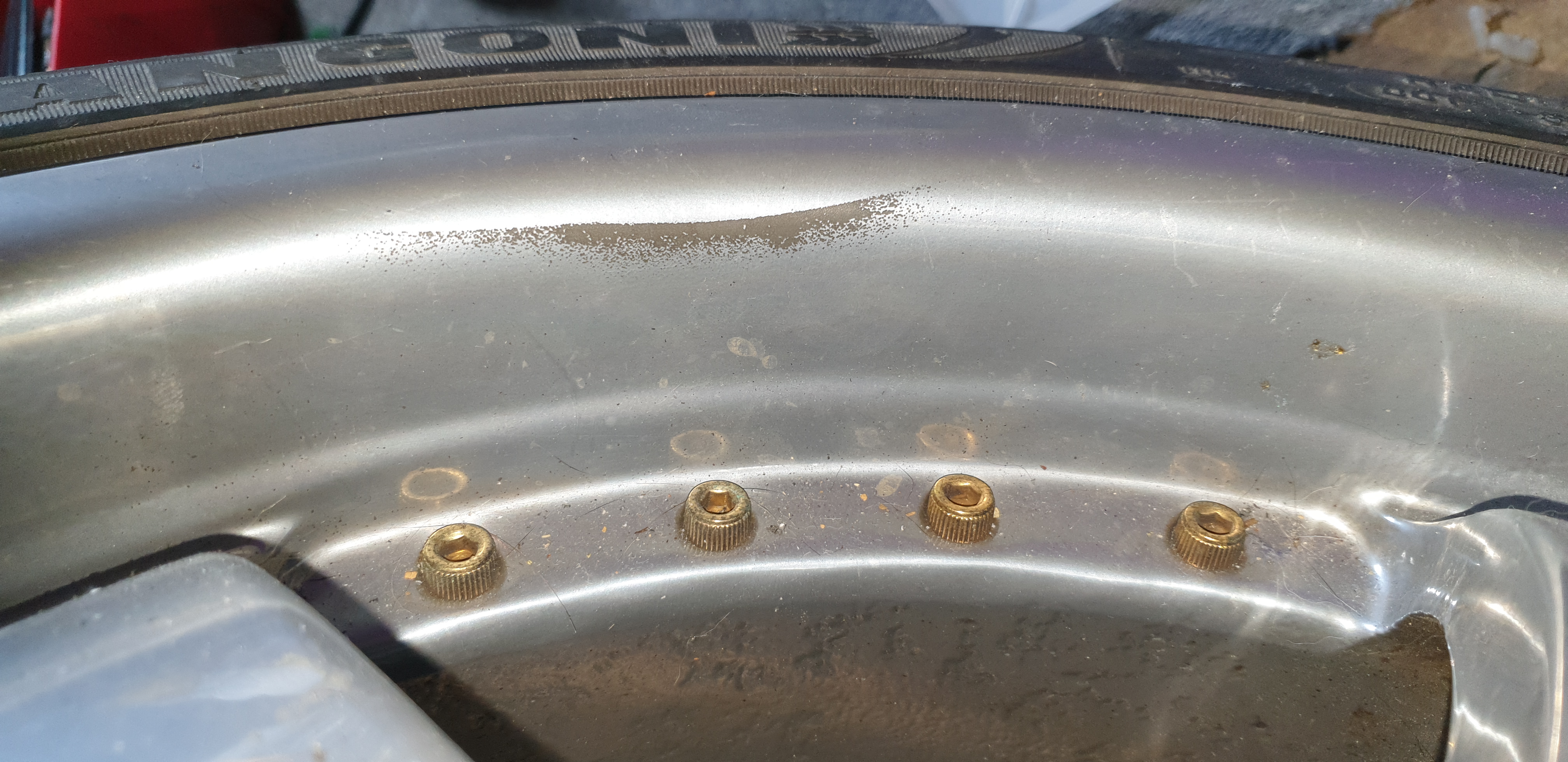 Geen stoeprandschade. Paar kleine plekjes. Een velg met een beetje zwarte nevel er op.